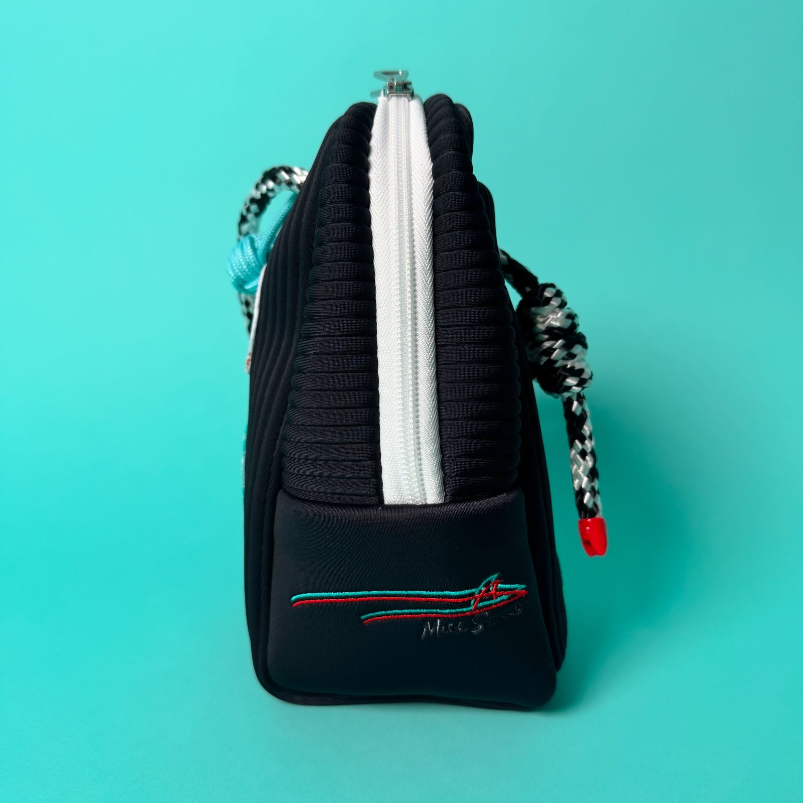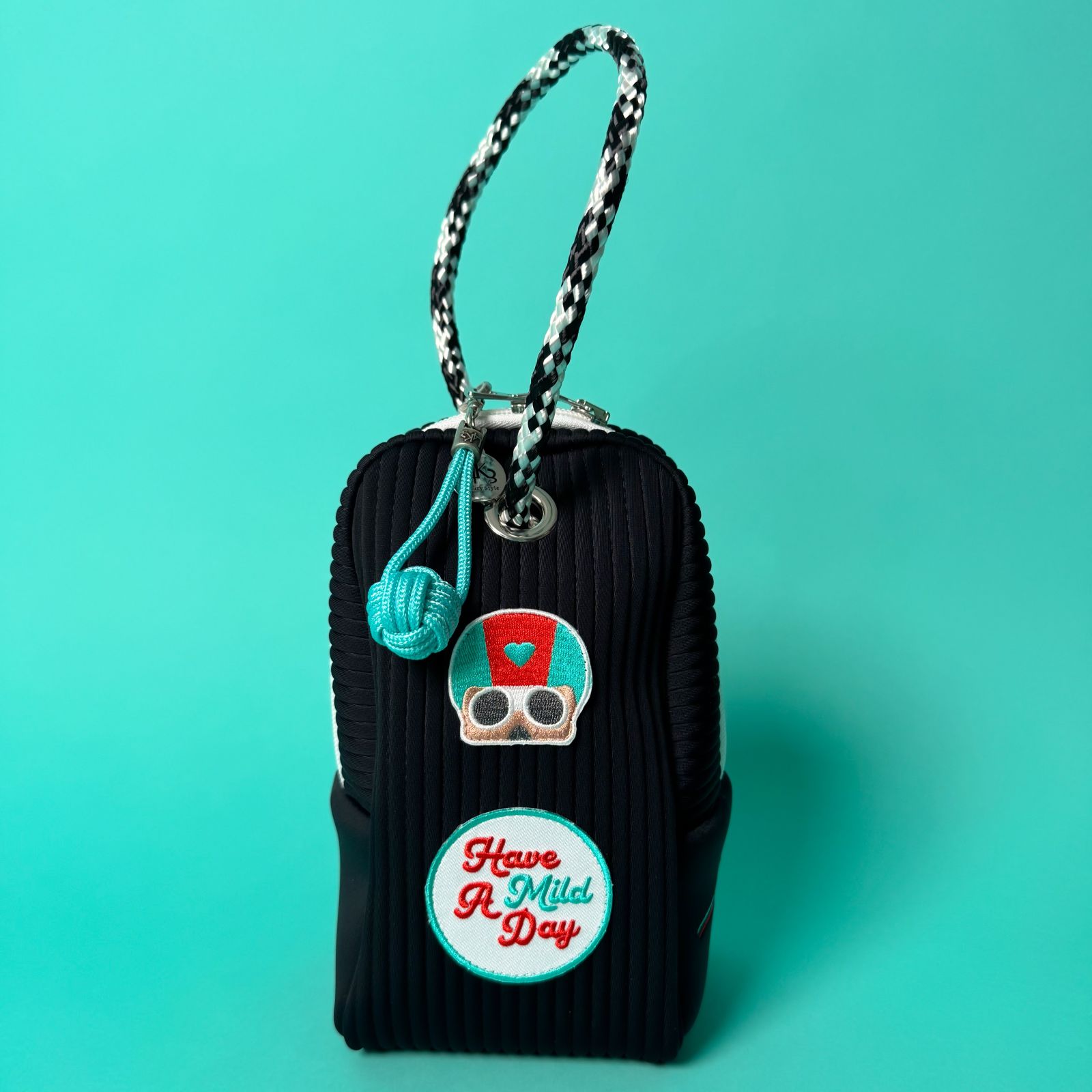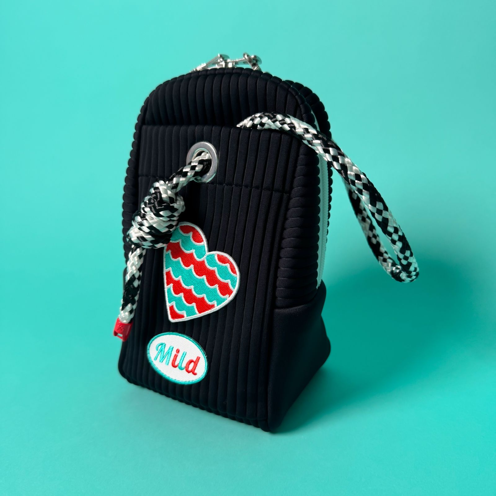 シックな色味のボディにMILDSUNSETのパッチとL4K3の航海用ロープのコントラストはどんなコーディネートにも遊び心のあるアクセントをきかせます。サイドにはMILDSUNSETのネーム刺繍もチラリ。
