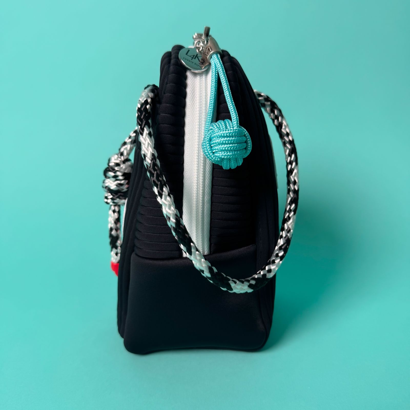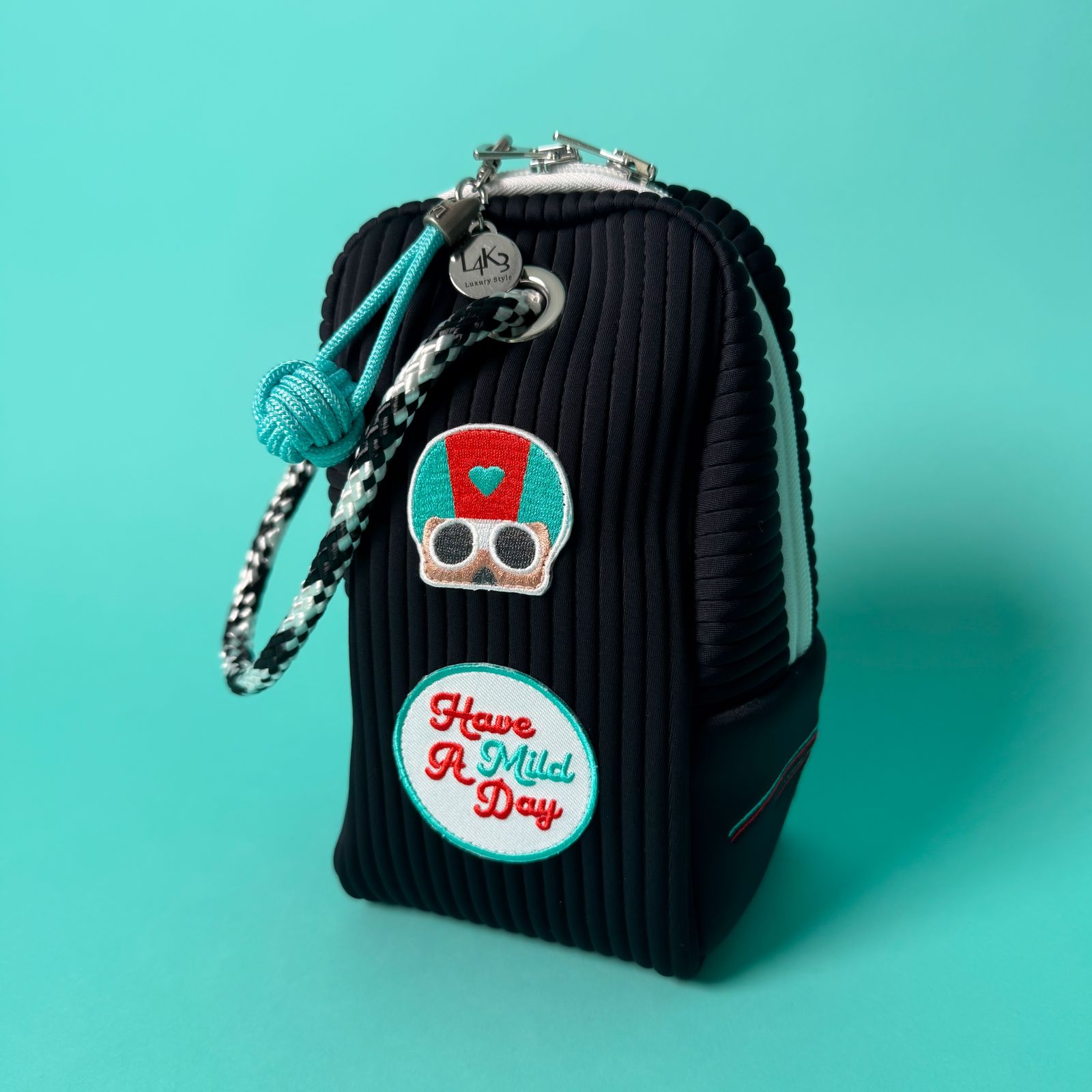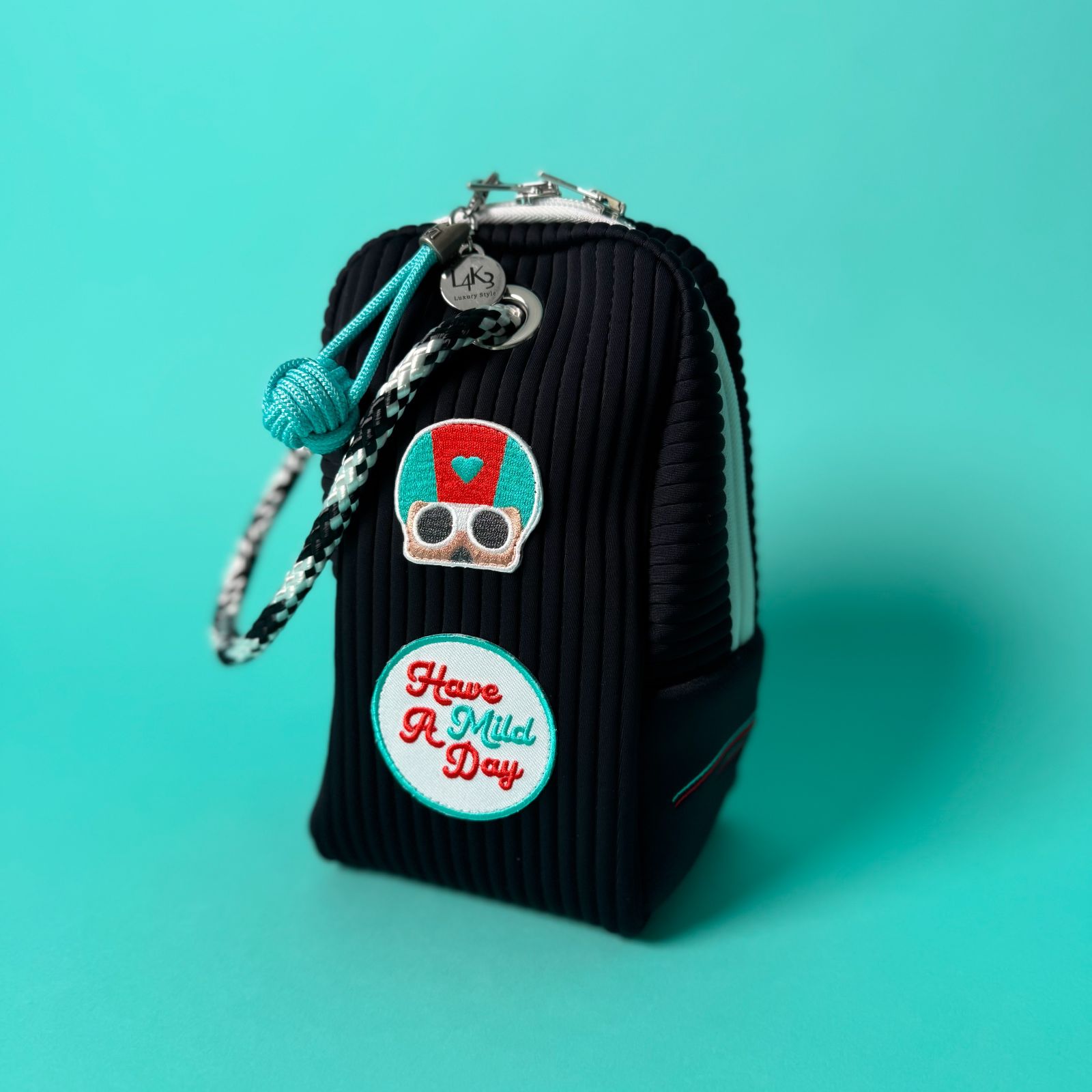 シックな色味のボディにMILDSUNSETのパッチとL4K3の航海用ロープのコントラストはどんなコーディネートにも遊び心のあるアクセントをきかせます。サイドにはMILDSUNSETのネーム刺繍もチラリ。